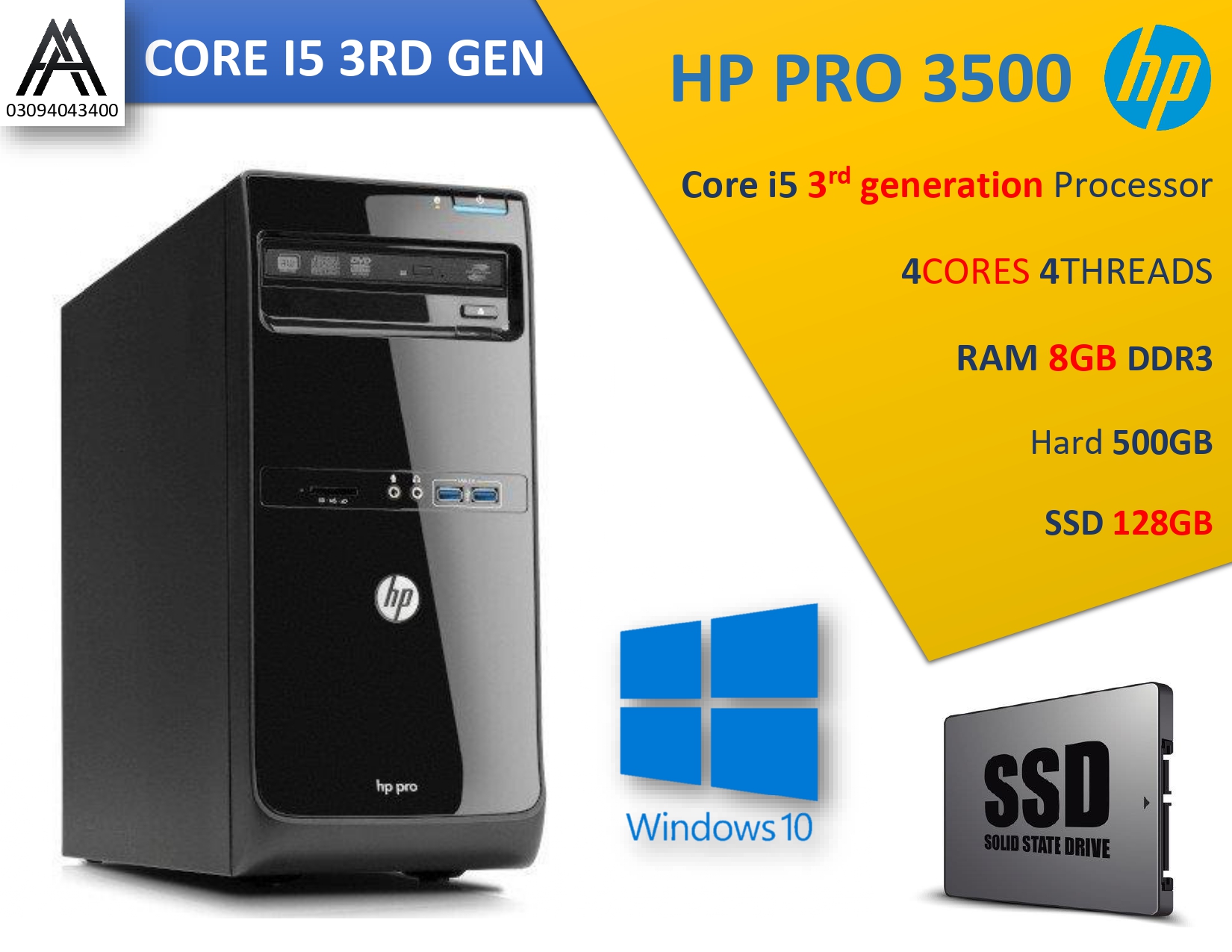 HP PRO 3500 PC With SSD-Core i5 3rd Generation 3470 Processor Upto 3.65Ghz – RAM 8GB DDR3 – 500GB Hard Drive-128GB SSD – Windows 10/10 PRO optional (Activated)